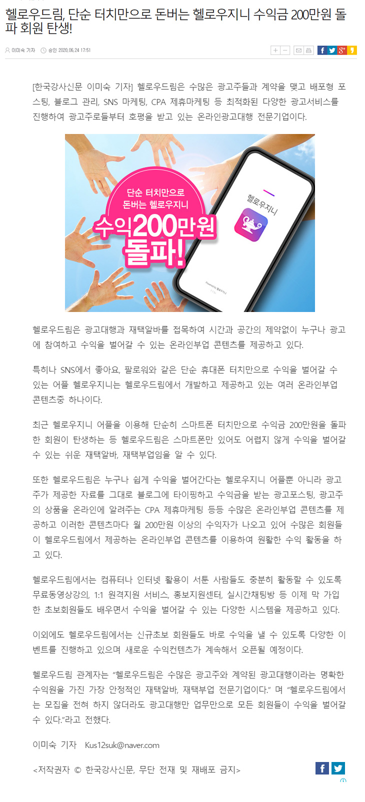 2020.06.24 "Çï·Î¿ìµå¸², ´Ü¼ø ÅÍÄ¡¸¸À¸·Î µ·¹ö´Â Çï·Î¿ìÁö´Ï ¼öÀÍ±Ý 200¸¸¿ø µ¹ÆÄ ȸ¿ø ź»ý!" ´º½º±â»ç µî·Ï!