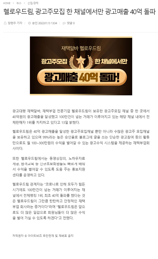 20220113 "Çï·Î¿ìµå¸², ±¤°íÁÖ¸ðÁý ÇÑ Ã¤³Î¿¡¼­¸¸ ±¤°í¸ÅÃâ 40¾ï µ¹ÆÄ" ´º½º±â»ç µî·Ï!