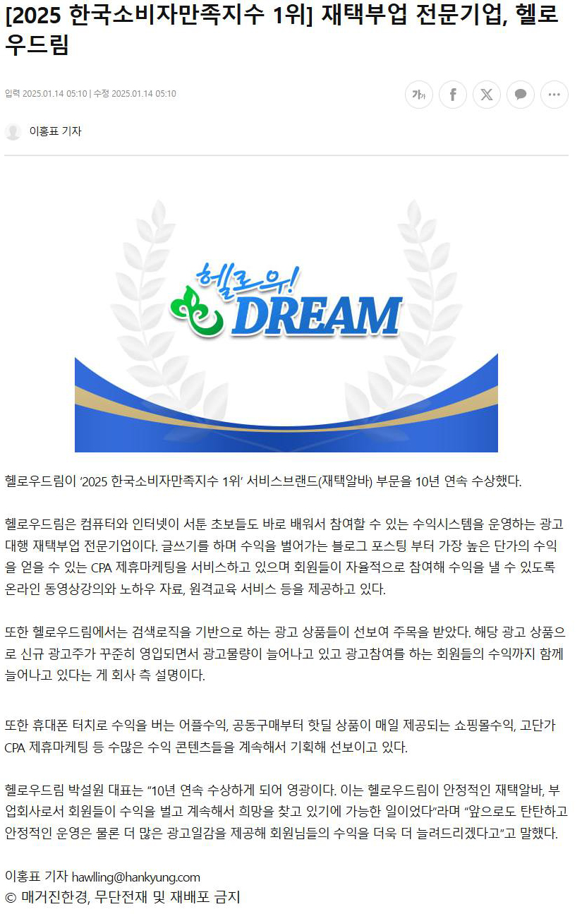 2025.01.14 ¡®2025 Çѱ¹¼ÒºñÀÚ¸¸Á·Áö¼ö 1À§¡¯ ¼ºñ½ººê·£µå(ÀçÅþ˹Ù) ºÎ¹® 10³â ¿¬¼Ó ¼ö»ó ´º½º±â»ç µî·Ï!